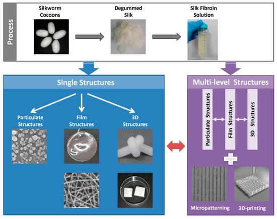 As SF possesses excellent processability, various forms of SF-based biomaterials can be fabricated using different treatments. To obtain the aqueous regenerated SF solution, silk is processed by the following steps (Figure 2). Degumming is the first step to processing raw silkworm silk. Then the degummed silk fibers are dissolved in a high molarity chaotropic salt solution such as LiBr or ionic liquids. The salts are subsequently removed via dialysis []. It is also possible to directly extract the SF from the posterior silk gland []. In the following section, we summarize the various structures of SF-based biomaterials, from single structures to multi-level structures, and discuss their corresponding biological functions.