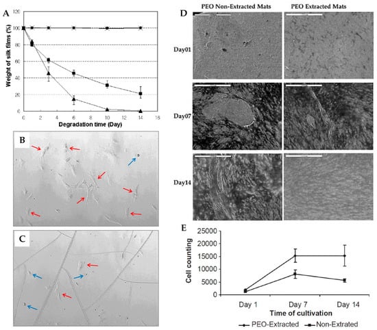 (A) Enzymatic degradation of SF films. (▲: SF films by water annealing in enzyme solution; ■: SF films by methanol treatment in enzyme solution; ×: SF films by water annealing in PBS; ●: SF films by methanol treatment in PBS), n = 5; Human bone-marrow stromal cells (hMSCs) attachment at 2 h on water-annealed SF film (B) and methanol-treated SF film (C). The cracks on the film in image (C) are induced by methanol treatment. Red arrows indicate fully attached cells and blue arrows indicate attaching cells. Reproduced from []; (D) SEM images of bone-marrow stromal cells (BMSCs) growing on polyethylene oxide (PEO) non-extracted and PEO extracted SF mats, respectively, after 1, 7, and 14 days. Scale bar: 500 µm; (E) Proliferation of BMSCs grown on SF mats. Seeding density: 2.5 E4 cells/cm2, n = 4. Reproduced from [].