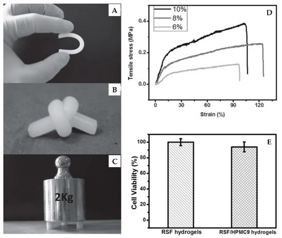 Images of regenerated silk fibroin (RSF)/hydroxypropyl methyl cellulose 9 (HPMC9) hydrogels’ reaction to bending (A), knotting (B) and compressing (C); (D) Representative tensile curves of RSF/HPMC9 hydrogels with different solid contents; (E) Cytotoxicity test of mouse fibroblast cells cultivated with RSF hydrogels and RSF/HPMC9 hydrogels; RSF/HPMCP9: the ratio of RSF to HPMC was 9/1. Reproduced from [].