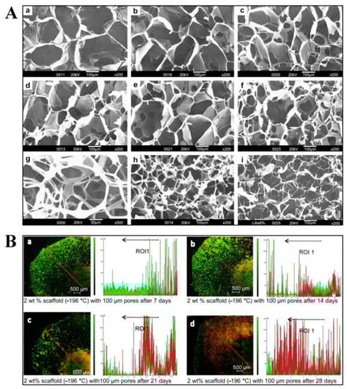 (A) Scanning electron microscope images of SF scaffolds fabricated by freeze-drying technique using (a–c) 2 wt % SF at −20 °C; (d–f) 4 wt % SF at −80 °C; and (g–i) 6 wt % SF at −196 °C; scale bar: (a–f,h,i): 100 µm; (g): 50 µm. (B) Confocal laser micrographs of human dermal fibroblast cell migration on SF porous scaffolds fabricated at −196 °C at different time points. The cells are stained with Hoechst 33342 for nuclei (green) and Rhodamine–phalloidin for actin filaments (red); scale bar: 500 µm. The black dotted arrows indicated the region and direction corresponding to the red dotted arrows on the previous graphs; ROI: region of interest. Reproduced from [].