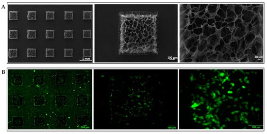 (A) Scanning electron microscope images of micropatterned SF/gelatin methacrylate (GelMA) porous scaffolds; (B) Fluorescence images (2×, 10×, and 20×) of NIH-3T3 fibroblast cells stained with live/dead viability kit after cultured on the micropatterning scaffolds for one day. Reproduced from [].