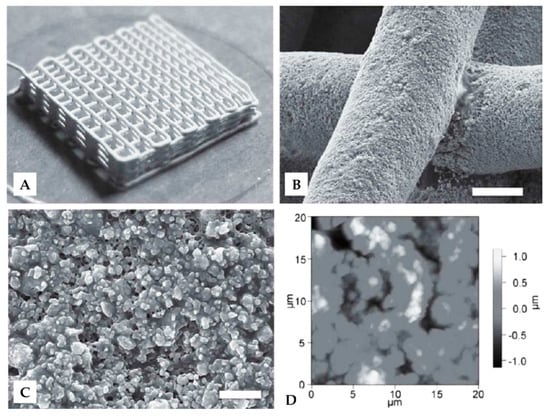 (A) Optical image of three-dimensional printing (3DP) silk/hydroxyapatite (HA) scaffold; (B) Scanning electron microscope image of individual silk/HA filaments at intersection. Scale bar: 100 µm; (C) Higher magnification image of the silk/HA filament surface. Scale bar: 10 µm; (D) Height profile of a representative silk/HA filament observed by atomic force microscopy (AFM). Reproduced from [].