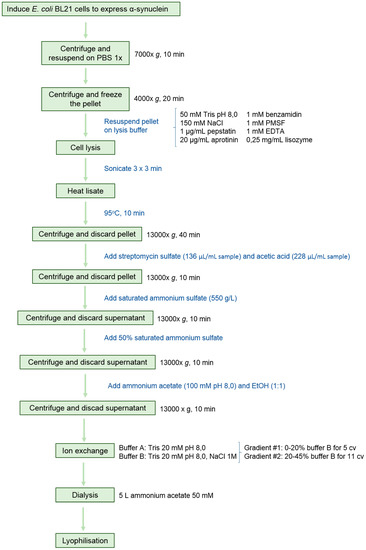 Human α-synuclein was expressed and purified adapting a previous protocol from Volles and Lansbury [32]. Escherichia coli BL21 (DE3) cells were transformed with a pET21a plasmid (Novagen, EMD-Millipore, Darmstadt, Germany) containing the α-syn cDNA, grown in LB medium containing 100 μM/mL ampicillin and induced with 1 mM IPTG for 4 h at an optical density at 600 nm of 0.6. After cell centrifugation at 7000× g for 10 min at 4 °C, the pellet was resuspended in 20 mL Phosphate Buffered Saline (PBS) buffer, centrifuged again at 4000× g for 20 min at 4 °C and frozen at −80 °C. When needed, the pellets were defrosted and resuspended in 10 mL lysis buffer (50 mM Tris pH 8, 150 mM NaCl, 1 μg/mL pepstatin, 20 μg/mL aprotinin, 1 mM benzamidine, 1mM PMSF, 1 mM EDTA and 0.25 mg/mL lysozyme) prior to sonication using a LabSonic®U sonicator (B. Braun Biotech International, Melsungen, Hessen, Germany) with a power level of 40 W and a repeating duty cycle of 0.7 s for 3 intervals of 3 min. Resultant cell extract was boiled at 95 °C for 10 min and centrifuged at 20,000× g for 40 min at 4 °C. To the obtained supernatant 136 μL/mL of 10% w/v streptomycin sulfate and 228 μL/mL of pure acid acetic were added and centrifuged at 4 °C (20,000× g, 10 min). The resulting soluble fraction was diluted with saturated ammonium sulfate (550 g/L) 1:1 (v/v) and centrifuged at 4 °C (20,000× g, 10 min). Then, the pellet was resuspended in 50% ammonium sulfate and centrifuged at 4 °C (20,000× g, 10 min). The pellet was washed with 100 mM pH 8 ammonium acetate (5 mL per culture litre) and pure EtOH 1:1 (v/v), then, the mixture was centrifuged at 4 °C (20,000× g, 10 min). The pellet was resuspended in 20 mM pH 8 Tris and filtered with a 0.45 mm filter. Anion exchange column HiTrap Q HP was coupled to an ÄKTA purifier high performance liquid chromatography system in order to purify α-synuclein. Tris 20 mM pH 8 and Tris 20 mM pH 8, NaCl 1 M were used as buffer A and buffer B respectively. After column equilibration with buffer A, sample was injected by using a Pump Direct Loading P-960 and the weak bonded proteins were washed with 5 column volumes (cv) of Buffer A. To properly isolate α-syn, a step gradient was applied as follows: (i) 0%–20% buffer B, 5 cv; (ii) 20%–45% buffer B, 11 cv; (iii) 100% buffer B, 5 cv, obtaining pure α-syn between 25% and 35% buffer B concentration. The collected peaks were dialyzed in 5 L ammonium sulfate 50 mM overnight. α-Syn concentration was determined measuring the absorbance at 280 nm and using the extinction coefficient 5960 M−1·cm−1. Purity was checked using 15% SDS-PAGE and unstained Protein Standard markers from Thermo Fisher Scientific. The gel was stained with comassie brilliant blue. Identity was checked by mass spectrometry. 2 μL of protein were dialyzed for 30 min at room temperature using 20 mL of 50 mM ammonic bicarbonate and a 0.025 μm pore membrane (EMD-Millipore, Darmstadt, Germany). After that, MALDI-TOF was analysis was performed with a ground steel plate and 2,6-dihidroxiacetophenone acid as a matrix, in a MALDI-TOF UltrafleXtreme (Bruker Daltonics, Billerica, MA, USA). A 1:1 sample:matrix mixture was used, adding just 1 μL of these sample to the plate. For the analysis, a lineal mode was used with an accelerated voltage of 25 kV. Finally, after lyophilisation, the protein was kept at −80 °C.