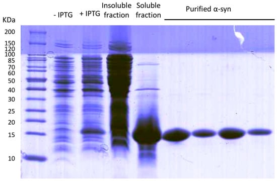Following this protocol, we obtained high amounts of nucleic acid free α-syn (35 mg/L culture). Purity of α-syn was checked by SDS-PAGE (Figure 2) and mass spectrometry, obtaining a band and a peak that corresponds to the theoretical weight of α-syn, respectively, without any trace of contaminant proteins.