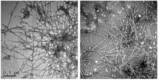 Agitation has been shown to accelerate α-syn aggregation up to 1 order of magnitude. The effect of the agitation is implicitly or explicitly attributed to mass transfer or fibril fragmentation. However, for α-syn, despite agitation with only air resulting in somewhat accelerated kinetics, in our hands, the reactions were inconsistent from well to well and even resulted in different aggregates morphology. The use of glass beads during agitation potentially increases the air–water interface area; however, their effect on the speed and reproducibility of the reaction is controversial [33,34]. Investigations have demonstrated the sensitivity of aggregation reactions to hydrophobic-water interfaces and in particular to teflon-water interfaces [35] and indeed teflon beads have been used in a number of α-syn aggregation studies [36,37]. Therefore, we incorporated a teflon bead (2 mm diameter) in each well and incubated the plates under continuous agitation in an orbital shaker, since it provides more homogeneous ball agitation than a linear one. The presence of these little spheres accelerated dramatically the kinetics of α-syn aggregation, allowing us to work with 70 μM α-syn in a final sample volume of 150 μL, thus reducing the amount of protein needed per reaction (0.145 mg/well). No aggregates were observed to form at the same protein concentration and conditions during the first 24 h in the absence of mixing balls, whereas in their presence, typical long unbranched amyloid fibrils could be observed by TEM (Transmission Electron Microscopy) (Figure 3).