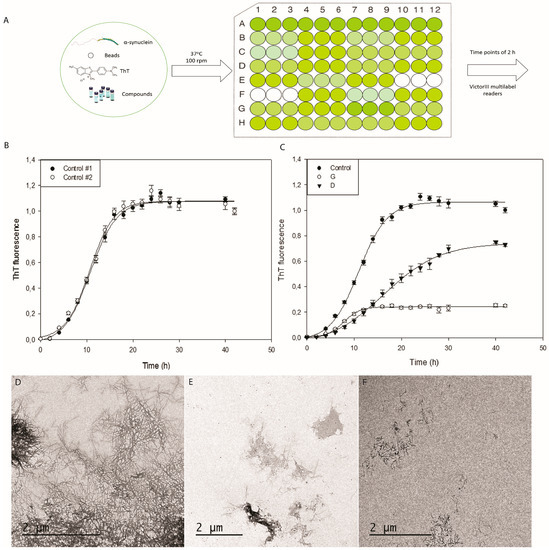 Aggregation kinetics, from plate preparation to putative inhibitors. (A) General scheme for plate preparation and incubation; (B) α-synuclein aggregation kinetics performed on non-consecutive days; (C) α-synuclein aggregation kinetics in presence of putative inhibitors. Measured by Th-T fluorescence emission, represented as normalised means. Error bars are represented as standard error. (D–F) TEM images of α-synuclein fibrils in absence (D) and presence of inhibitors (D–G).