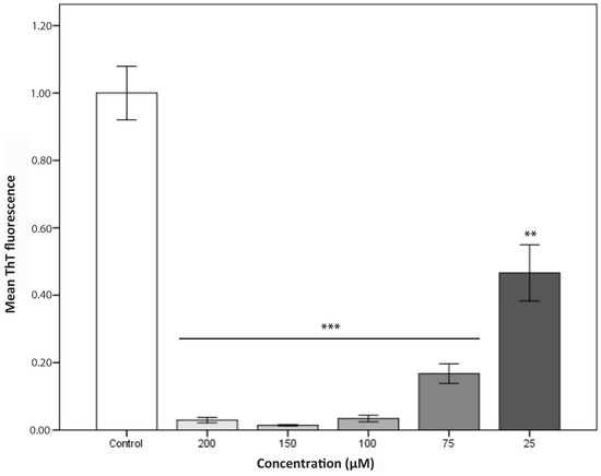 Inhibition of α-synuclein aggregation at different concentrations of the compound D. Error bars are represented as standard error, where p < 0.005 and p < 0.0005 were indicated by ** and *** respectively.