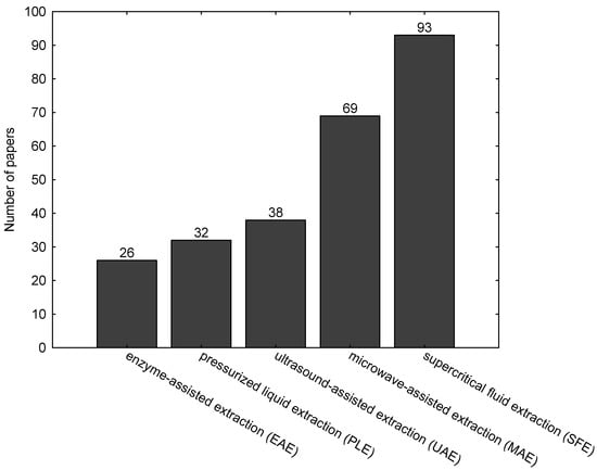 Different extraction techniques—traditional such as solvent extraction and novel such as supercritical fluid extraction (SFE), microwave-assisted extraction (MAE), ultrasound-assisted extraction (UAE), enzyme-assisted extraction (EAE) and pressurized liquid extraction (PLE)—are used to extract biologically active compounds from algae []. Among these techniques, the least scientific attention is paid to the enzymatic extraction of algae (Figure 1).