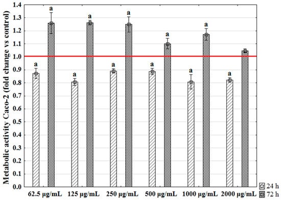 The influence of the E. prolifera extracts on Caco-2 metabolic activity. The statistically significant differences were tested at p level 0.05 (statistically significant difference marked as “a”). The normative value was determined based on a control culture’s metabolic activity (red line).