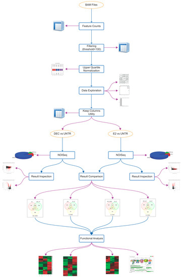 - Tarazona, S.; Furio-Tari, P.; Turra, D.; Pietro, A.D.; Nueda, M.J.; Ferrer, A.; Conesa, A. Data quality aware analysis of differential expression in RNA-seq with NOISeq R/Bioc package. Nucleic Acids Res. 2015, 43, e140. [Google Scholar] [CrossRef] [PubMed]