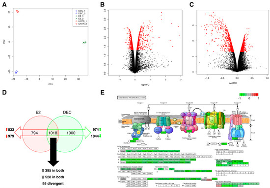 Gene expression analysis of stimulated dendritic cells. (A) Principal component analysis of filtered and normalized read counts. Clustering of replicates of bone marrow-derived dendritic cells (BMDCs) treated with PBS (UNTR_1 and UNTR_2), pulsed with E2 (E2_1 and E2_2) and fd-scαDEC-205 (DEC_1 and DEC_2) upon PCA are shown. (B,C) Volcano plots show, in red dots, the genes that are differentially expressed (red dots, PP > 0.95) in BMDCs stimulated with E2- (panel B) and fd-scαDEC-205 (panel C) in pairwise comparisons vs. untreated cells. (D) Comparison of the differentially expressed genes on BMDCs upon stimulation with E2 (red circle) and fd-scαDEC-205 (green circle) using Venn diagrams. Empty red and green arrows indicate genes with altered expression upon E2 and fd-scαDEC-2055 stimulation, respectively. Black arrows indicate the genes whose expression is affected upon exposure to both antigen delivery systems. (E) Graphical representation of the pathway analysis results for genes of the oxidative phosphorylation pathway (OXPHOS in Kyoto Encyclopaedia of Genes and Genomes (KEGG) database) that are modulated upon stimulation with both antigen delivery systems. As an example, genes that are down-modulated upon fd-scαDEC-205 exposure are depicted. Color intensity is proportional to the fold-change.