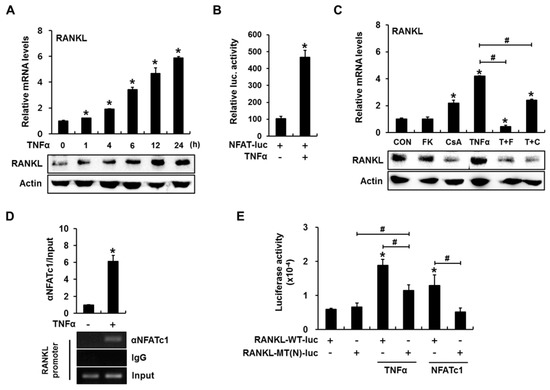 Calcineurin/nuclear factor of activated T-cells (NFAT) activation is involved in tumor necrosis factor α (TNFα)-induced receptor activator of nuclear factor-κB ligand (RANKL) expression in C2C12 cells. (A) TNFα increased RANKL expression in a time-dependent manner. C2C12 cells were incubated in the presence of 10 ng/mL TNFα for the indicated time periods and subjected to quantitative reverse transcription-polymerase chain reaction (RT-PCR) and western blot analyses. Quantitative data are presented as means ± standard deviations (SD); (B) TNFα induces NFAT transcriptional activity. C2C12 cells were transfected with a reporter plasmid containing an NFAT response element, exposed to TNFα for 24 h, and subjected to a luciferase assay. Data are presented as firefly luciferase activity levels relative to Renilla activity; (C) Inhibition of the calcineurin/NFAT pathway blocked TNFα-mediated RANKL expression. C2C12 cells pretreated with FK506 (10 μg/mL) or cyclosporin A (10 μg/mL) were treated with TNFα for 24 h and subjected to RT-PCR and western blot analyses; (D) TNFα increases NFAT binding to the mouse RANKL promoter. C2C12 cells were incubated for 24 h with TNFα, after which a chromatin immunoprecipitation (ChIP) assay was performed using an antibody against NFATc1, with IgG serving as a negative control. The RANKL promoter region containing the NFAT binding element was amplified via PCR. Quantitative ChIP data were normalized to the input and are presented as values relative to vehicle-treated control samples (CON) (E) TNFα increased RANKL promoter–reporter activity in an NFAT binding element-dependent manner. C2C12 cells were transfected with a wild-type (RANKL-WT-luc) or NFAT-binding site mutant (RANKL-MT(N)-luc) RANKL promoter reporter, incubated for 24 h in the presence of TNFα or NFAT overexpression vector, and subjected to a luciferase assay (* p < 0.05, compared to control; # p < 0.05, compared to the indicated pair).
