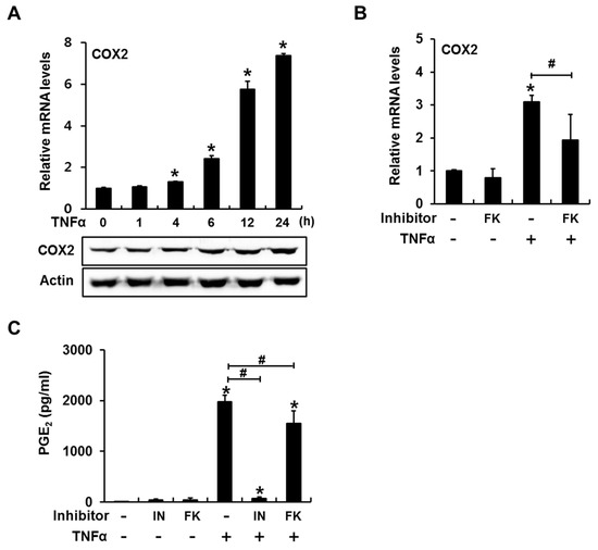 The calcineurin/NFAT signaling pathway mediates TNFα-induced cyclooxygenase 2 (COX2) expression and prostaglandin E2 (PGE2) production in C2C12 cells. (A) TNFα stimulated COX2 mRNA and protein expression in a time-dependent manner; (B) TNFα-mediated COX2 expression decreased following inhibition of the calcineurin/NFAT signaling pathway. C2C12 cells pretreated with the calcineurin phosphatase inhibitor FK506 (10 μg/mL) were incubated in the presence or absence of TNFα for 24 h and subjected to RT-PCR analyses; (C) TNFα-induced PGE2 production was blocked by indomethacin, a COX inhibitor. Treatment with FK506 slightly suppressed TNFα-induced PGE2 production. C2C12 cells were incubated with FK506 or indomethacin (20 μM) in the presence of TNFα for 24 h and subjected to a PGE2 parameter assay (* p < 0.05, compared to control; # p < 0.05).