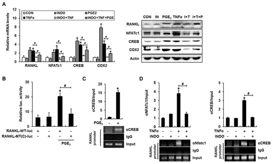 The COX inhibitor indomethacin blocks TNFα-induced binding of NFATc1 and cAMP response element-binding protein (CREB) to the RANKL promoter in C2C12 cells. (A) PGE2 increased the expression of RANKL, NFATc1, CREB, and COX2, whereas indomethacin suppressed TNFα-mediated RANKL, NFATc1, CREB, and COX2 expression. Treatment with PGE2 in the presence of indomethacin and TNFα partially rescued the expression of RANKL, NFATc1, CREB, and COX2. C2C12 cells were incubated with the indicated reagents for 24 h and subjected to RT-PCR and western blot analyses; (B) PGE2 increased RANKL promoter–reporter activity in a CREB binding element-dependent manner. C2C12 cells were transfected with RANKL-WT-luc or a CREB-binding site mutant (RANKL-MT(C)-luc) RANKL promoter, incubated for 24 h in the presence of PGE2, and subjected to a luciferase assay; (C) PGE2 induced CREB binding to the mouse RANKL promoter. C2C12 cells were incubated for 24 h with PGE2 and subjected to a ChIP assay with CREB and control IgG antibodies. The RANKL promoter region containing the CREB-binding element was then amplified; (D) Indomethacin prevented TNFα-induced NFAT and CREB binding to the mouse RANKL promoter. C2C12 cells were incubated for 24 h with the indicated reagents and subjected to a ChIP assay (* p < 0.05, compared to control; # p < 0.05).
