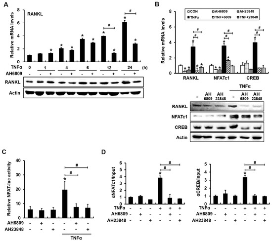 The PGE2 receptor antagonists AH6809 and AH23848 suppress the TNFα-induced activation of NFAT and binding of NFATc1 and CREB to the RANKL promoter in C2C12 cells. (A) PGE2 receptor antagonists significantly inhibited TNFα induction of RANKL only after incubation for 12 and 24 h; (B) AH6809 and AH23848 blocked TNFα-mediated RANKL, NFATc1, and CREB expression. AH6809 and AH23848 partially suppressed TNFα-induced NFATc1 protein expression. C2C12 cells were incubated with AH6809 (5 μM) or AH23848 (5 μM) in the presence or absence of TNFα for 24 h; (C) PGE2 receptor antagonists abolished TNFα-induced NFAT transcriptional activity; (D) PGE2 receptor antagonists prevented TNFα-induced NFAT and CREB binding to the mouse RANKL promoter (* p < 0.05, compared to control; # p < 0.05).