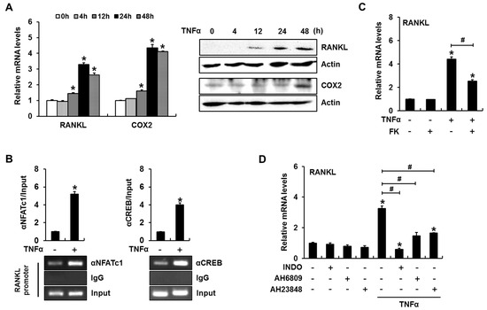 PGE2 production and NFAT activation are necessary for TNFα-induced RANKL expression in primary cultured mouse calvarial cells. (A) TNFα enhanced the expression of RANKL and COX2. Calvarial cells were incubated in the presence of TNFα for the indicated time periods and subjected to RT-PCR and western blot analyses; (B) ChIP assays revealed that TNFα increased NFATc1 and CREB binding to their cognate binding sites in the mouse RANKL promoter; (C) A calcineurin/NFAT signaling inhibitor suppressed TNFα-induced RANKL expression. Calvarial cells were incubated for 24 h in the presence of FK506 and TNFα; (D) Treatment with a COX2 inhibitor or PGE2 receptor antagonists suppressed TNFα-induced RANKL expression. (* p < 0.05, compared to control; # p < 0.05).