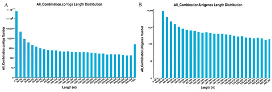 Raw data of M. roridum transcriptome: (A) the distribution of contigs in M. roridum transcriptome; and (B) the distribution of unigenes in M. roridum transcriptome.