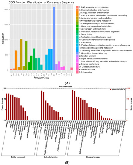 COG function and GO function classification of the M. roridum transcriptome. (A) COG functional classification of the M. roridum transcriptome; (B) GO functional classification of the M. roridum transcriptome.