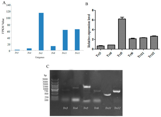 Identification of unigenes involved in trichothecene biosynthesis in M. roridum: (A) prediction of expression levels of unigenes involved in trichothecene biosynthesis according to the FPKM value; (B) validation of expression levels of unigenes involved in trichothecene biosynthesis by qRT-PCR; (C) agarose electrophoresis of qRT-PCR products of unigenes involved in trichothecene biosynthesis.