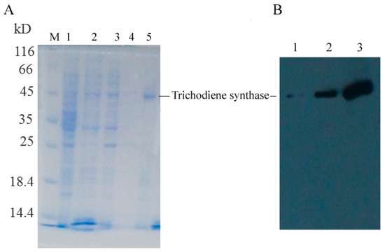 Identification of Tri5 gene: (A) expression and purification of trichodiene synthase encoded by Tri5 gene from M. roridum: M. Protein Marker; 1. Un-induced sample; 2. Total proteins of induced samples; 3. Supernatant of induced sample; 4. 55 mM imidazole eluate; and 5. 100 mM imidazole eluate; and (B) Western blot analysis of trichodiene synthase encoded by Tri5 gene from M. roridum: 1. Total proteins of un-induced sample; 2. Supernatant of induced sample; and 3. 55 mM imidazole eluate.