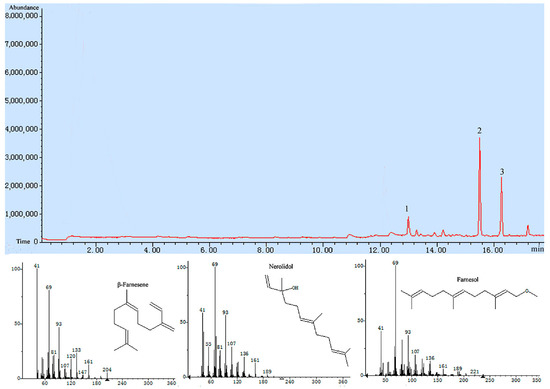 Specific primers were designed to amplify the Tri4, Tri5, and Tri11 genes with restriction enzyme sites (NdeI and XhoI), then the amplified fragment was inserted into vector pET28a and expressed in Escherichia coli BL21 (DE3) with a molecular weight of 52.0, 45.0, and 50.0 kDa, respectively, which was in accordance with the theoretical value. The trichodiene synthase was purified by Ni affinity chromatography with a purity of 91.9% (Figure 5A). The Western blot analysis result using anti-His monoclonal antibody confirmed the successful expression and purification of the Tri5 gene (Figure 5B). Trichodiene synthase from M. roridum encoded by Tri5 gene were added to the substrate FPP, and the catalyzation products were detected by GC-MS (Gas Chromatograph-Mass Spectrometer), and the sesquiterpenoids including β-farnesene, nerolidol and farnesol were detected, nerolidol was detected as a main product, which accounted for 68.2% of all the catalyation products (Figure 6). The result further demonstrated that the trichodiene synthase encoded by Tri5 was a sesquiterpene synthase.