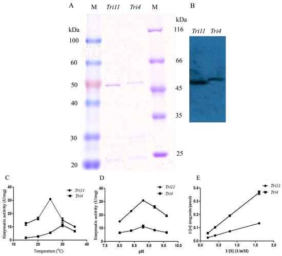 Identification of Tri4 and Tri11 genes: (A) the expression and purification of enzymes encoded by Tri4 (TRO-MR) and Tri11 (ITH-MR), M indicated protein marker; (B) the Western blot analysis of TRO-MR and ITH-MR using anti-His monoclonal antibody; (C) the optimal reaction temperatures of TRO-MR and ITH-MR; (D) the optimal reaction pH values of TRO-MR and ITH-MR; and (E) the enzymatic kinetics of TRO-MR and ITH-MR, the Km and Vmax values were calculated.