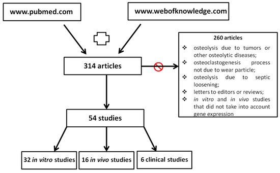 There were 260 excluded articles because they regarded: (1) osteolysis due to tumors or other osteolytic diseases (such as rickets, dialysis patients, arthritis and hormonal abnormalities); (2) osteoclastogenesis process not due to wear particle; (3) osteolysis due to septic loosening; and (4) letters to editors or reviews. Only the studies that compared healthy and wear-mediated osteolytic conditions, from a molecular point of view, were analyzed (Figure 1).