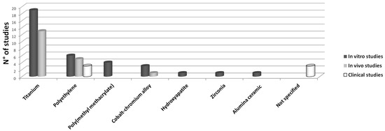 In vitro, in vivo and clinical studies dealing with different types of wear particles. The abscissa axis indicates the type of particles, while the ordinate axis indicates the number of studies dealing with each type of particles.