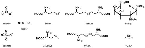 Structures of bioselenocompounds used in this study. SeCN−: selenocyanate, SeMet: l-selenomethionine, MeSeCys: Se-methylseleno-l-cysteine, SeHLan: l-selenohomolanthionine, SeCys2: selenocystine, SeSug1: Se-methylseleno-N-acetylgalactosamine, TMSe+: trimethylselenonium ion.