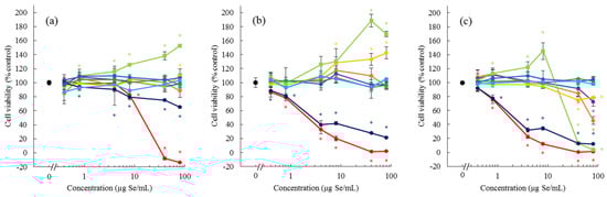 Effect of bioselenocompounds on Caco-2 and HepG2 cell viability. Caco-2 cells were exposed to , , , , , , , , or for 6 h (a). HepG2 cells were exposed to each bioselenocompound for 24 h (b) and 48 h (c). Points and bars are means ± SD for 3 wells. Statistical analysis included the one-way analysis of variance followed by the Student’s t-test. The level of significance was set at p < 0.05, and is indicated by an asterisk (*).