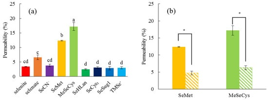Permeability from the apical side to the basolateral side of Caco-2 cells. The permeability of the nine bioselenocompounds was compared (a). A 500 μL aliquot of fresh medium containing 1 μg Se/mL of each bioselenocompound was poured into the insert and the medium in the lower chamber was collected after 90 min. Values and bars are means ± SD for 3 wells. Statistical analysis was performed by the Tukey test. The level of significance was set at p < 0.05, and values that have a different letter are significantly different. The effects of Met on the permeability of SeMet and MeSeCys were evaluated (b). Hatched and solid bars represent with and without 10 mM Met, respectively. Points and bars are means ± SD for 3 wells. Statistical analysis include the one-way analysis of variance followed by the Student’s t-test. The level of significance was set at p < 0.05, and is indicated by an asterisk (*).