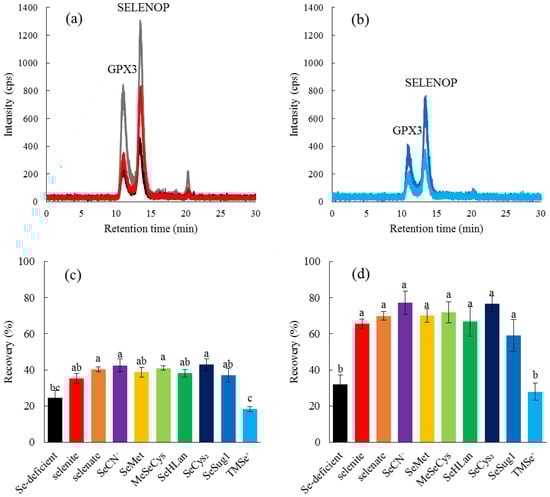 (b) or (b). Se bioavailability was evaluated from the recovery of Se in two serum selenoproteins, i.e., glutathione peroxidase (GPX3) (c) and selenoprotein P (SELENOP) (d), in the sera of Se-adequate rats, Se-deficient rats administered saline, , , , , , , , , or . Values and bars are means ± SD for 3 wells. Statistical analysis was performed by the Tukey test. The level of significance was set at p < 0.05, and values that have a different letter are significantly different.