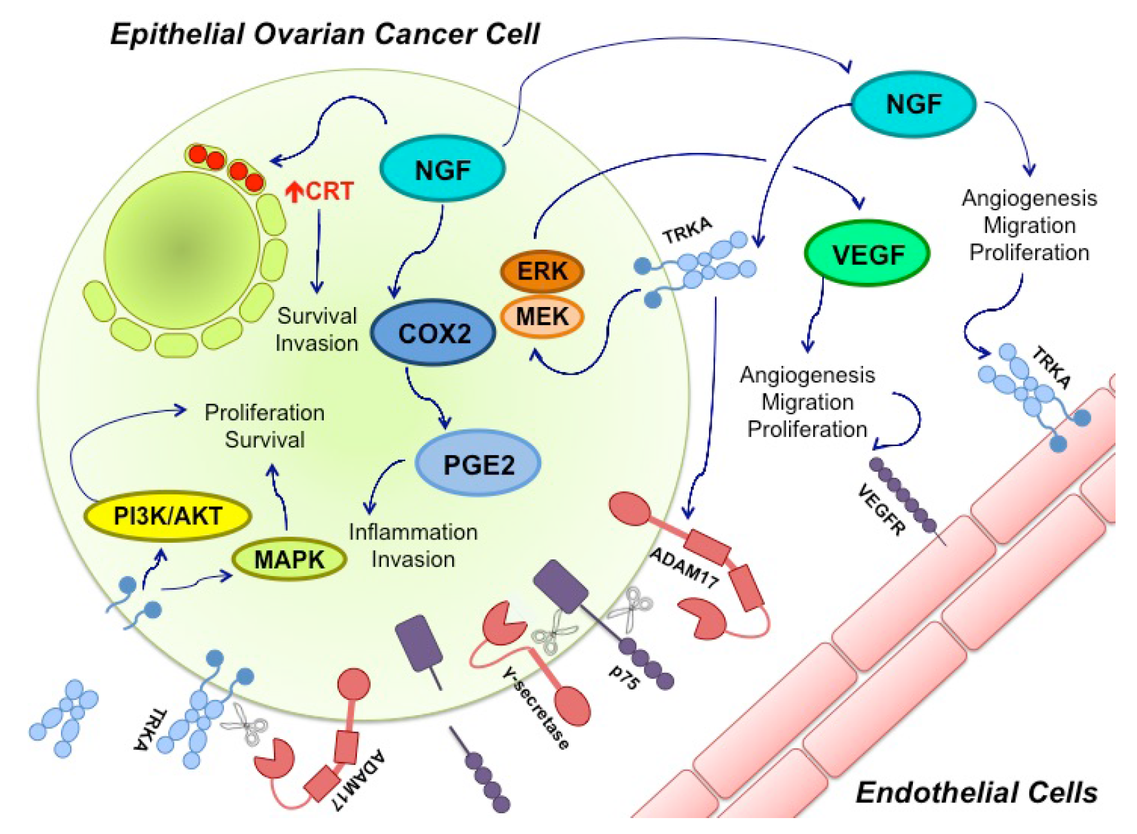 Nerve growth factor (NGF) and its Tyrosine Kinase A receptor (TRKA) are involved in several signaling pathways in epithelial ovarian cancer (EOC). Ovarian cancer cells express and secrete NGF. Through TRKA activation, NGF induces angiogenesis by directly stimulating endothelial cell proliferation and migration. NGF also regulates angiogenesis in an indirect manner through vascular endothelial growth factor (VEGF) production by epithelial cancer cells. This mechanism involves TRKA activation and the Mitogen-activated protein kinase/Extracellular signal-regulated kinase (MEK/ERK) signaling pathway. Besides, NGF increases ciclooxigenase-2 (COX-2) levels, a proinflamatory molecule that induces protaglandine-2 (PGE-2) production; COX-2 and PGE-2 have been associated with invasion in cancer cells. NGF can also increase calreticulin (CRT) levels (Red Arrow), an endoplasmic reticulum resident whose levels have been found to be elevated in several cancers, where it participates in cell survival and invasion. Disintegrin and metalloproteinase domain-containing protein 17 (ADAM17), a proteinase, also seems to be regulated by NGF-TRKA activation. ADAM17 cleaves the p75 receptor, which is then cleaved a second time by γ-secretase. The biological effects of these cuts remain unknown. ADAM 17 can also cleave TRKA, leaving its intracellular domain active, which contributes to cancer progression through the MAPKs and PI3K/Akt pathways.