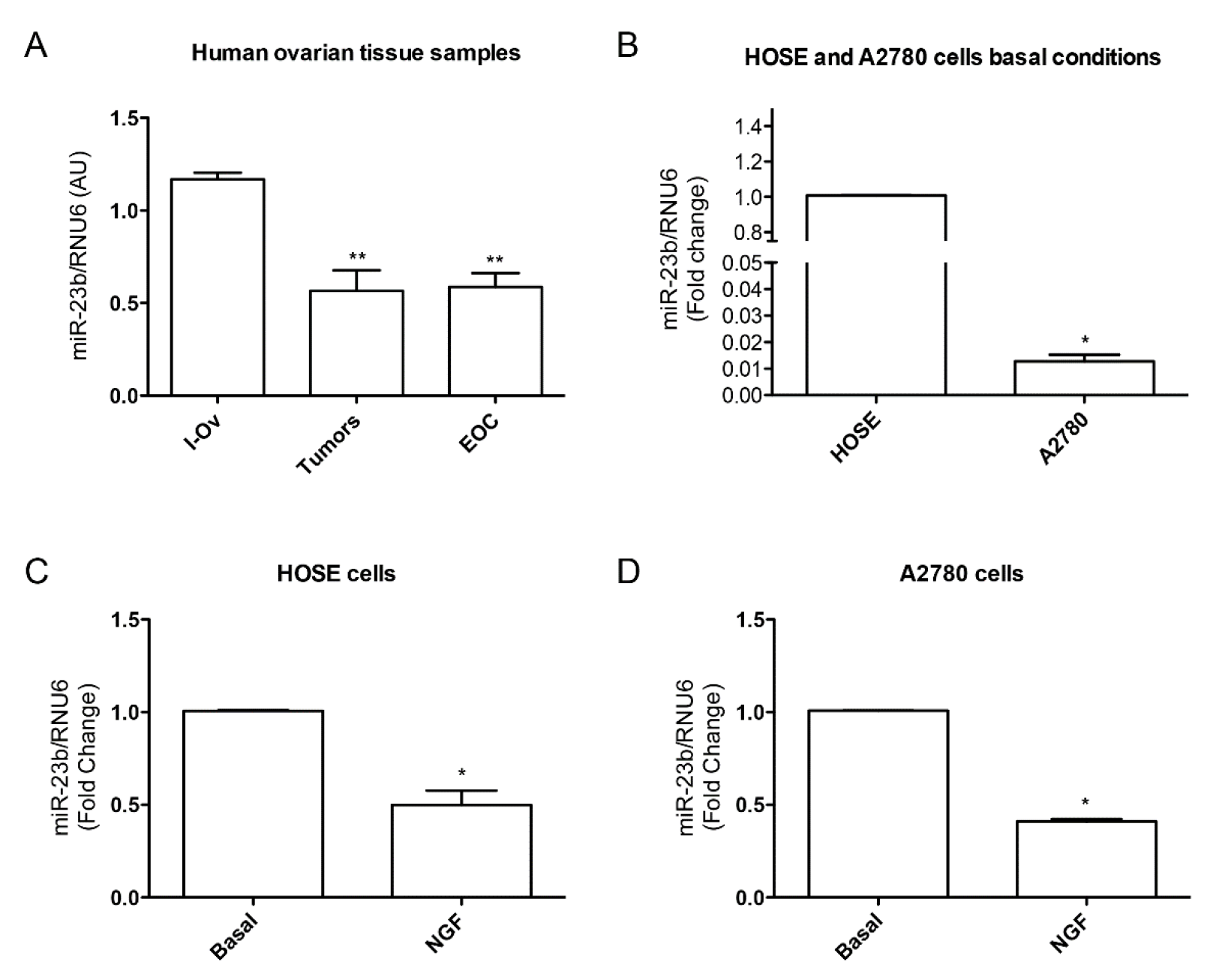 miR-23b levels in epithelial ovarian cancer and its relationship with NGF in cell lines. (A) miR-23b levels in tissues from inactive ovary (I-Ov), tumor and EOC samples. miR-23b levels from tumor and EOC samples are significantly lower than I-Ov (** = p < 0.01); (B) miR-23b basal level comparision between HOSE and A2780 cell lines (* = p < 0.05); (C) NGF effect on miR-23b levels in HOSE cell line. NGF reduces miR-23b levels respect to basal condition (* = p < 0.05); (D) NGF effect on miR-23b levels in A2780 cell line. NGF reduces miR-23b levels respect to basal condition (* = p < 0.05). Stadistic: Kruskal–Wallis Test: A; Mann–Whitney Test: B, C and D.
