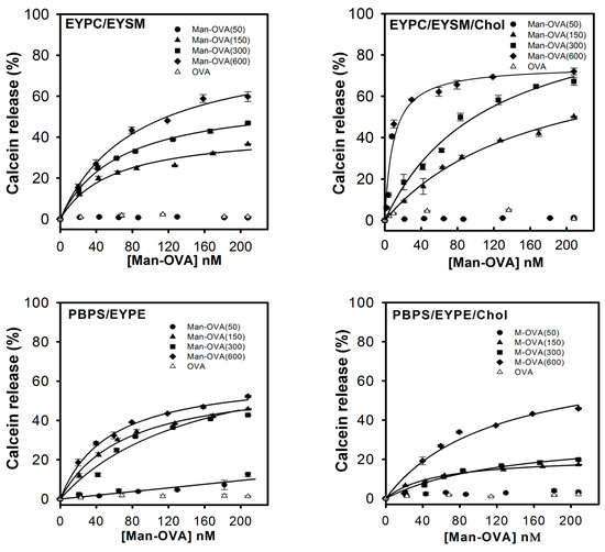 Previous studies have revealed that OVA induces leakage from PS/PE vesicles in acidic solutions [8]. PS and PE are generally enriched in the inner leaflet, while phosphatidylcholine (PC), sphingomyelin (SM), and glycosphingolipids, are predominant in the outer leaflet of the cell membrane [14]. Moreover, cholesterol (Chol) is universally present in large amounts (20–40 mol %), in both the outer and inner leaflets of the cell membrane [15]. Therefore, the phospholipid vesicles composed of egg yolk phosphatidylcholine (EYPC)/egg yolk sphingomyelin (EYSM) (53/47, mol/mol), EYPC/EYSM/Chol (37/33/30, mol/mol/mol), porcine brain phosphatidylserine (PBPS)/egg yolk phosphatidylethanolamine (EYPE) (50/50, mol/mol), and PBPS/EYPE/Chol (35/35/30, mol/mol/mol), which mimicked the properties of the outer or inner leaflets of the cell membrane [16,17], were used to study the membrane-damaging activities of Man-OVA and OVA. Figure 1 shows that Man-OVA(150), Man-OVA(300), and Man-OVA(600) induced a dose-dependent leakage in all four types of vesicles. However, Man-OVA(50) was unable to increase the permeability of EYPC/EYSM, EYPC/EYSM/Chol, and PBPS/EYPE/Chol vesicles, but marginally induced that of PBPS/EYPE vesicles. A maximal calcein release from all four types of vesicles was observed when using Man-OVA(150), Man-OVA(300), and Man-OVA(600), at concentrations >200 nM. Moreover, the membrane-damaging activity of Man-OVA(600) on all tested vesicles was higher than that noted for Man-OVA(150) and Man-OVA(300). These results suggested that an increase in the number of modified carboxyl groups promoted the membrane-perturbing activity of Man-OVA. In contrast, OVA did not induce membrane permeability in the tested vesicles. Because Man-OVA(600) showed the highest membrane-damaging activity, this Man-OVA was employed to further explore the mechanism of glycation-induced membrane damage. Man-OVA(600) induced the maximal calcein release of approximately 59.7%, 71.5%, 52.2%, and 45.9%, from EYPC/EYSM, EYPC/EYSM/Chol, PBPS/EYPE, and PBPS/EYPE/Chol vesicles, respectively. This result indicated that the lipid composition might affect the membrane-damaging activity of Man-OVA.