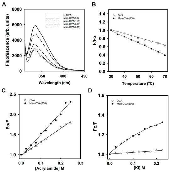 Figure 2A shows that the conjugation of carboxyl groups with p-aminophenyl α-d-mannopyranoside reduced the Trp fluorescence intensity of OVA, suggesting that glycation of OVA altered the microenvironment of its Trp residues [18]. Meanwhile, titration of OVA with p-aminophenyl α-d-mannopyranoside marginally reduced its Trp fluorescence intensity (Figure S2). This result indicated that the incorporated glycated groups might not quench the Trp fluorescence of OVA. As shown in Figure 2B, the reduction in the Trp fluorescence of Man-OVA(600) with an increase in temperature was greater than that of OVA, suggesting that the structural stability of Man-OVA(600) was lower than that of OVA. Linear Stern–Volmer plots obtained for OVA and Man-OVA(600) revealed that all of the Trp residues in respective proteins are equally accessible to acrylamide (Figure 2C). However, the susceptibility of the Trp residues in Man-OVA(600) to acrylamide was higher than that of the residues in OVA, suggesting that the spatial positional changes caused by glycation caused the Trp residues in OVA to become more exposed. Previous studies have shown that iodide quenching could reveal whether the Trp residues in proteins were located in a positively charged environment [19]. Therefore, iodide quenching of Man-OVA and OVA was analyzed using the Stern-Volmer plot. A linear plot for OVA in Figure 2D indicates an equal accessibility of all Trp residues to iodide. However, the downward curve observed for Man-OVA(600) is suggestive of two possible classes of Trp fluorophores [19], of which one is more accessible to iodide than the other. Nevertheless, the accessibility of the Trp residues in Man-OVA(600) to iodide was higher than that of the residues in OVA, suggesting that the microenvironment of the Trp residues in Man-OVA(600) contained a greater number of positively charged residues than that of OVA. This is consistent with the fact that the conjugation of carboxyl groups with p-aminophenyl α-d-mannopyranoside decreases the number of negatively charged residues in OVA.