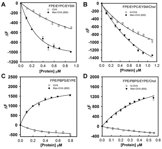 The fluorescence intensity of N-(fluorescein-5-thiocarbamoyl)-1,2-dihexadecanoyl-phosphatidylethanolamine (FPE) is sensitive to the ionization state of the carboxyl group of fluorescein, and it increases when the negative surface charge of the membrane is reduced by the binding of a protein [21]. In contrast, the addition of proteins with a negative charge increases the membrane’s negative electrostatic potential, causing a reduction in FPE fluorescence [22]. As shown in Figure 3A,B, the fluorescence intensity of FPE in FPE/EYPC/EYSM and FPE/EYPC/EYSM/Chol vesicles decreased with increasing Man-OVA or OVA concentrations. However, Man-OVA(600) caused a greater reduction in FPE fluorescence than OVA. The binding of OVA to FPE/PBPS/EYPE and FPE/PBPS/EYPE/Chol vesicles reduced the FPE fluorescence intensity, whereas the binding of Man-OVA(600) enhanced its intensity (Figure 3C,D). These findings suggested that Man-OVA(600) and OVA adopted different topographical arrangements upon absorption on EYPC/EYSM, EYPC/EYSM/Chol, PBPS/EYPE, and PBPS/EYPE/Chol vesicles. The binding affinities of Man-OVA and OVA for lipid vesicles were determined by the changes in FPE fluorescence. The dissociation constants (Kd) of Man-OVA for EYPC/EYSM, EYPC/EYSM/Chol, PBPS/EYPE, and PBPS/EYPE/Chol vesicles, were 0.38 ± 0.05, 0.60 ± 0.02, 0.26 ± 0.04, and 0.67 ± 0.03 μM, respectively. The Kd values of OVA for EYPC/EYSM, EYPC/EYSM/Chol, PBPS/EYPE, and PBPS/EYPE/Chol vesicles, were 0.90 ± 0.03, 0.30 ± 0.04, 0.43 ± 0.03, and 0.27 ± 0.02 μM, respectively. Evidently, the inability of OVA to damage the membrane was not related to its ability to bind phospholipid vesicles.