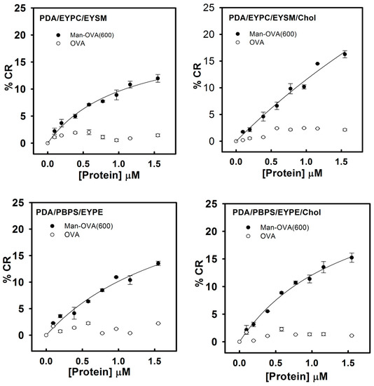 Previous studies have indicated that lipid/polydiacetylene (PDA) vesicles mimic the environment in the cell membranes and provide information on the binding of pore-forming peptides with membranes [23,24]. The blue-to-red transformation in lipid/PDA vesicles depends on the disruption of the interface and structure of the lipid bilayer by membrane-interacting peptides [18]. Peptides that preferably disrupted the lipid head-group region or penetrated the hydrophobic lipid core induced pronounced color transitions [24,25]. Therefore, a higher colorimetric response (%CR) reflected the higher ability of the membrane-interacting peptides to perturb the membrane structure. As shown in Figure 4, compared to OVA, Man-OVA(600) induced a notable increase in the %CR of PDA/EYPC/EYSM, PDA/EYPC/EYSM/Chol, PDA/PBPS/EYPE, and PDA/PBPS/EYPE/Chol vesicles, suggesting that distinct structural features of OVA and Man-OVA(600) were in contact with the interface of EYPC/EYSM, EYPC/EYSM/Chol, PBPS/EYPE, and PBPS/EYPE/Chol vesicles.
