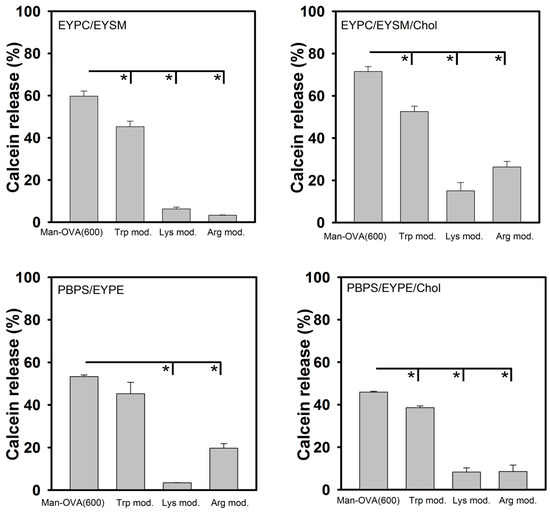 Membrane-damaging activity of Trp-, Lys-, and Arg-modified Man-OVA(600). Man-OVA(600) and modified Man-OVA(600) induced calcein release from EYPC/EYSM, EYPC/EYSM/Chol, PBPS/EYPE, and PBPS/EYPE/Chol vesicles (* p < 0.05). The concentrations of protein and lipid vesicles were 0.2 and 15 μM, respectively.