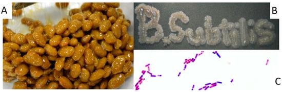 Natto—a traditional Japanese food produced from soybeans fermented by Bacillus subtilis (natto). (A) Natto-Fermented Soy Beans; (B) B. subtilis (natto) isolated from natto; (C) Micrograph of gram stained cells of B. subtilis (natto) (1000×).