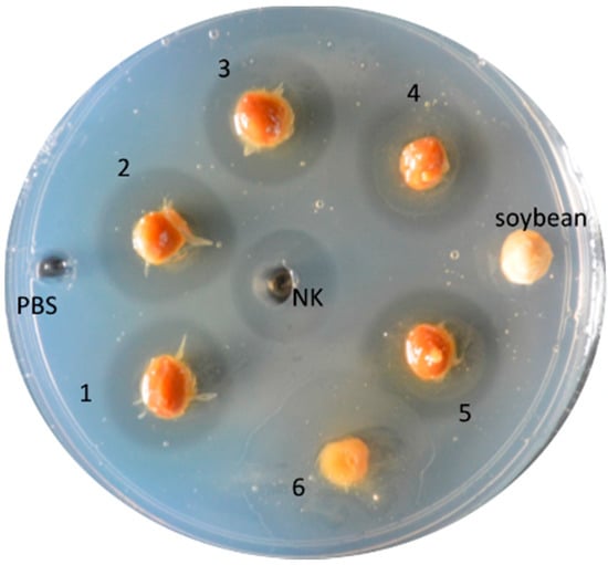 Natto and nattokinase can dissolve fibrin (semi-transparent halo ring). (1–5) Natto-fermented soy beans; (6) Slimy material characteristic of natto; (NK) Commercial nattokinase (100 µg) as a positive control; Non-fermented soybean and PBS (phosphate buffered saline) as negative controls.