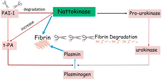Nattokinase has a strong ability to breakdown thrombi and fibrin. Even a single dose of NK has been reported to result in fibrinolysis via the cleavage of cross-linked fibrin [10]. In that study, 12 healthy, young males were randomly administered a single capsule of NK (2000 FU). The antithrombin concentration in their blood increased significantly two hours after the oral consumption of the NK capsule. FDP fragments and d-dimers were observed four and six hours after NK administration, respectively, and factor VIII activity declined four hours after NK ingestion. The results of this study indicated that multiple different pathways may be involved in NK fibrinolysis and anti-coagulation activity.