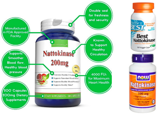 At present, commercial NK products (Figure 4) are widely-used in Japan, China, Korea, European Union Countries, Canada, and the United States as a food supplement to thin blood, prevent blood clots, and improve blood circulation. Studies also indicate that NK can ameliorate other diseases such as hypertension [4], stroke [17], Alzheimer’s disease [18], and atherosclerosis [19]. The potential of using NK to decrease atherothrombotic risk and slow the progression of atherosclerosis as well as cognitive decline is currently being assessed in a Phase II clinical trial (ClinicalTrials.gov Identifier: NCT02080520, 28 May 2015).