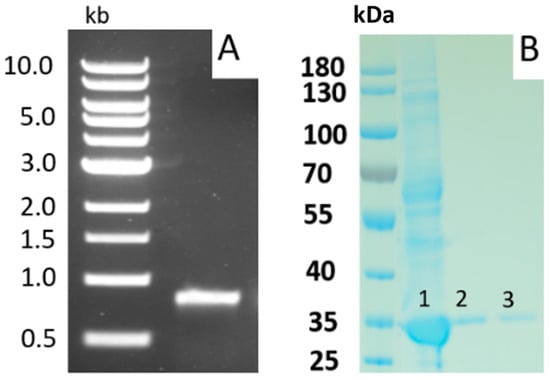 NK gene product and insoluble (inclusion-body) NK protein in Escherichia coli. (A) PCR-derived NK gene product from B. subtilis (natto); (B) Lane 1: NK protein present in crude medium extract; Lane 2 and 3: NK protein purified using a Ni-NTA (nickel-charged affinity nitrilotriacetic acid) column.