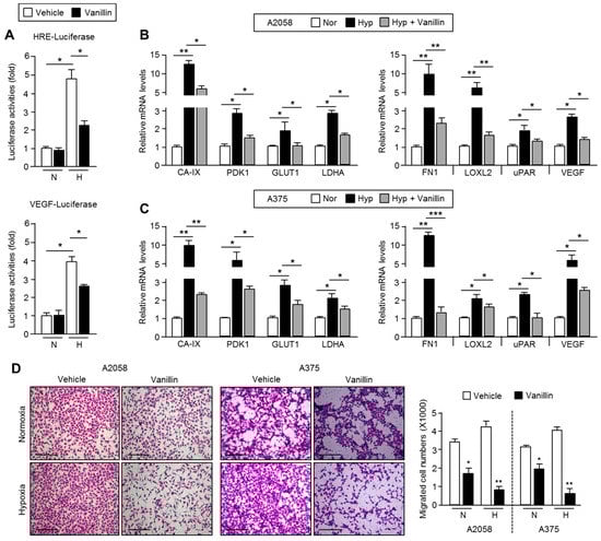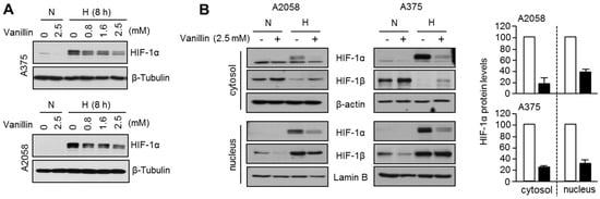 2.2. Vanillin Decreases HIF-1α Protein Levels under Hypoxia in A2058 and A375 Malignant Melanoma Cells