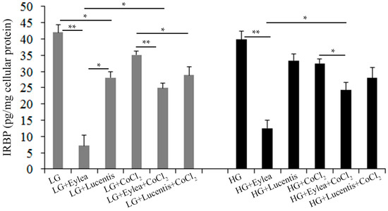 - Garcia-Ramirez, M.; Hernandez, C.; Villarroel, M.; Canals, F.; Alonso, M.A.; Fortuny, R.; Masmiquel, L.; Navarro, A.; Garcia-Arumi, J.; Simo, R. Interphotoreceptor retinoid-binding protein (IRBP) is downregulated at early stages of diabetic retinopathy. Diabetologia 2009, 52, 2633–2641. [Google Scholar] [CrossRef] [PubMed]