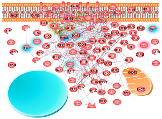One of the proteins of the integrin pathway found only in sample 2 was the ASAP1 protein (Arf-GAP with SH3 domain, ANK repeat and PH domain-containing protein 1). As we demonstrated by Elsevier Pathway Studio® analysis, this protein interacts with several other proteins (Figure 2). Amongst them are vinculin (VCL), a rather abundant protein detectable by MS with an average LfQ of 11.82 × 109, and less abundant proteins such as paxillin (PXN) with an average LfQ value of 0.46 × 109, focal adhesion kinase 1 (PTK2, average LfQ = 0.72 × 109) as well as ADP-ribosylation factor 6 (ARF6, average LfQ = 0.6 × 109) (Figure 2). Their presence could be confirmed by Western blotting (Figure 1). ASAP1 regulates membrane traffic and cytoskeleton organization [19] and influences cell spreading and migration [20]. Directed by the Crk-like protein, it accumulates within the focal adhesion complex [21]. There, it co-localizes with PXN and VCL, which are able to bind to each other [19,22], and ASAP1 associates also with the focal adhesion kinase. Under unknown conditions, ASAP1 may cause a repositioning of PXN and focal adhesion kinase within the focal adhesion complex, which retards cell spreading [23]. ASAP1 has also been observed to bind to ARF6 [24]. This binding appears to facilitate the recruitment of ASAP1 to the focal adhesion complex [25]. Interestingly, the ASAP1 gene was up-regulated in adherent FTC-133 cells after 24 h of incubation [11]. However, after 10 d in space, the ASAP1 gene was 7-fold down-regulated in adherent cells, while it remained unregulated in spheroid cells [5].