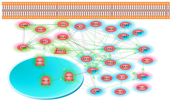 The interaction and localization of proteins, belonging to the angiopoietin signaling pathway and found in samples 2 and/or 3. All proteins marked by a uniform green or blue rim were found in samples 2 and 3, while the proteins of CHUK, IKBKB, BIRC5, RAS1, PIK3R2, PAK1IP1 and AKT2, marked by a upper half red rim were found only in sample 3. Proteins of CHUK, IKBKB, BIRC5, RAS1, IKBKAP, IKBKG, PTPN11, NFKB1, NFKB2 and RELA belong to the angiopoietin pathway only. The rest of the proteins belong to the integrin signaling and the angiopoietin pathway simultaneously. Arrows indicate interaction, while T-bars show inhibition; schemes of a membrane bilayer, a nucleus (circle) and a mitochondrion outline localization.