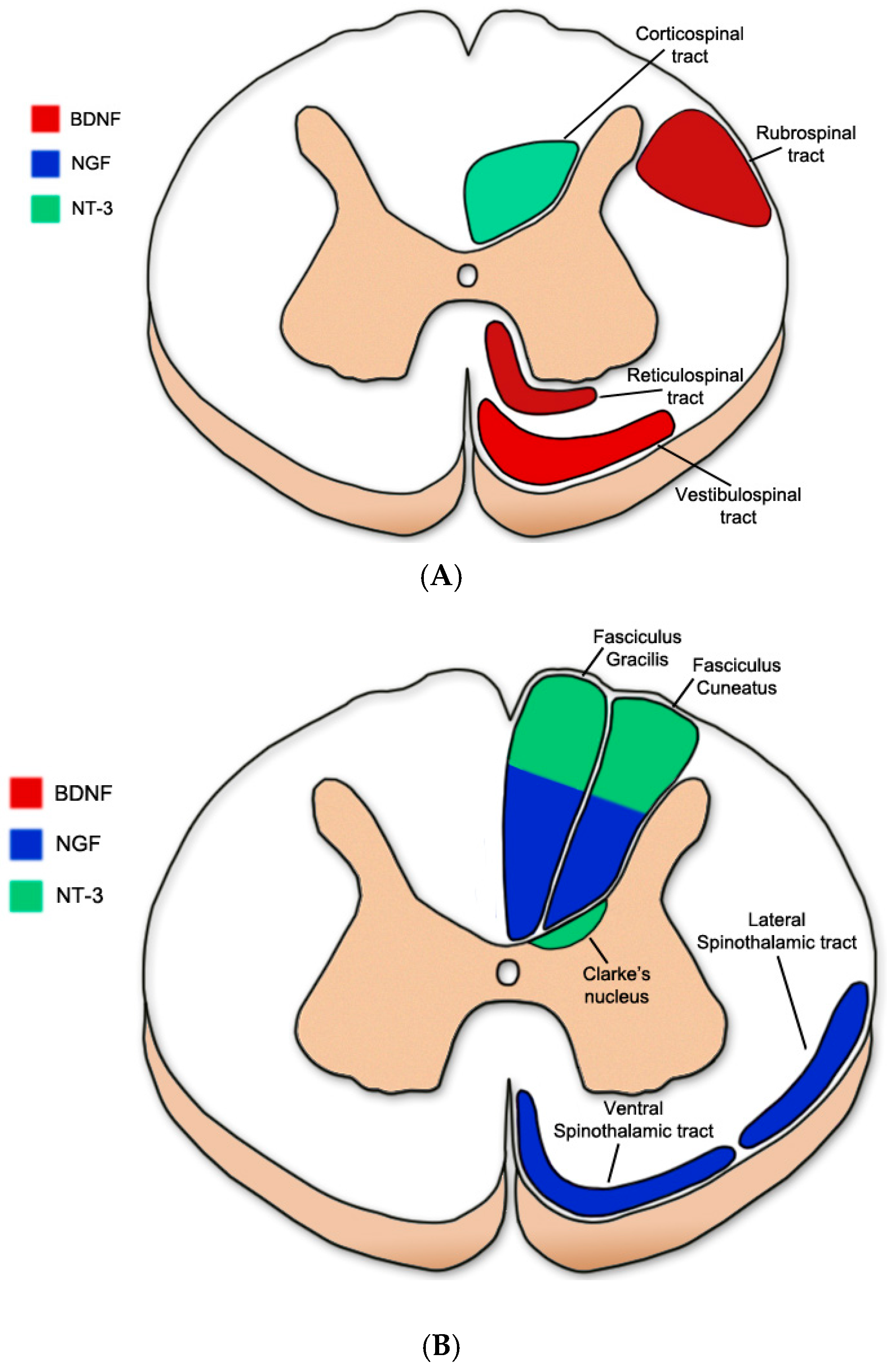 In the context of spinal cord injury, the presence of Trk receptors may provide treatment targeted to specific spinal cord tracts. Figure 2 outlines neurotrophins which elicit growth responses from common motor (Figure 2A) and sensory (Figure 2B) tracts in the spinal cord (Clarke’s nucleus (proprioceptive): [45]; Corticospinal tract: [46,47]; Fasciculus Cuneatus and Fasciculus Gracilis: [48,49,50,51,52]; Reticulospinal tract: [53,54]; Rubrospinal tract: [54,55,56]; Spinothalamic tract: [50,57,58]; Vestibulospinal tract: [53]).