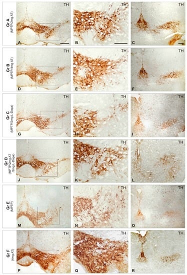- Cavalcanti, J.R.; Pontes, A.L.; Fiuza, F.P.; Silva, K.D.; Guzen, F.P.; Lucena, E.E.; Nascimento-Júnior, E.S.; Cavalcante, J.C.; Costa, M.S.; Engelberth, R.C.; et al. Nuclear organization of the substantia nigra, ventral tegmental area and retrorubral field of the common marmoset (Callithrix jacchus): A cytoarchitectonic and TH-immunohistochemistry study. J. Chem. Neuroanat. 2016, 77, 100–109. [Google Scholar] [CrossRef] [PubMed]